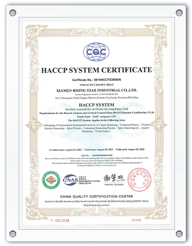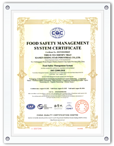 The company has been well established with a sound quality management system over the whole supply chain, ensuring to obtain a high level ofquality assurance. The company has got the Food Production license issued by the Industry & Commerce Bureau, the Export Food Permissionissued by the Xiamen Customs, and the certificates of ISO 9001 and HACCP verified by CQC.