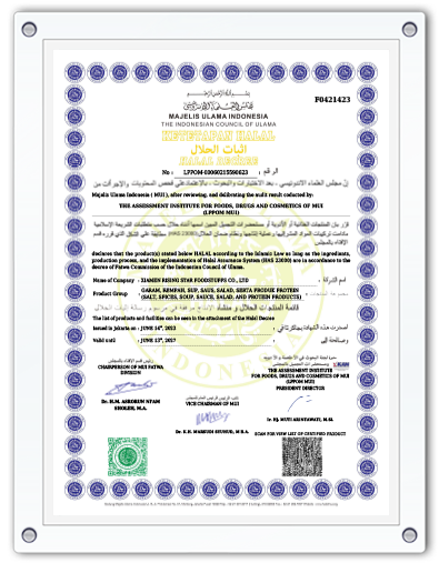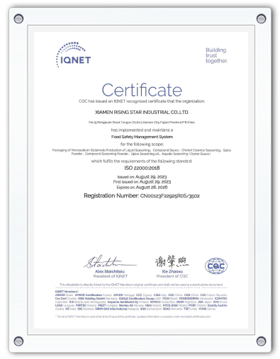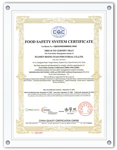 The company has been well established with a sound quality management system over the whole supply chain, ensuring to obtain a high level of quality assurance. The company has got the Food Production license issued by the Industry & Commerce Bureau, the Export Food Permission issued by the Xiamen Customs, and the certificates of ISO 22000, FSSC22000 and HACCP verified by CQC.
